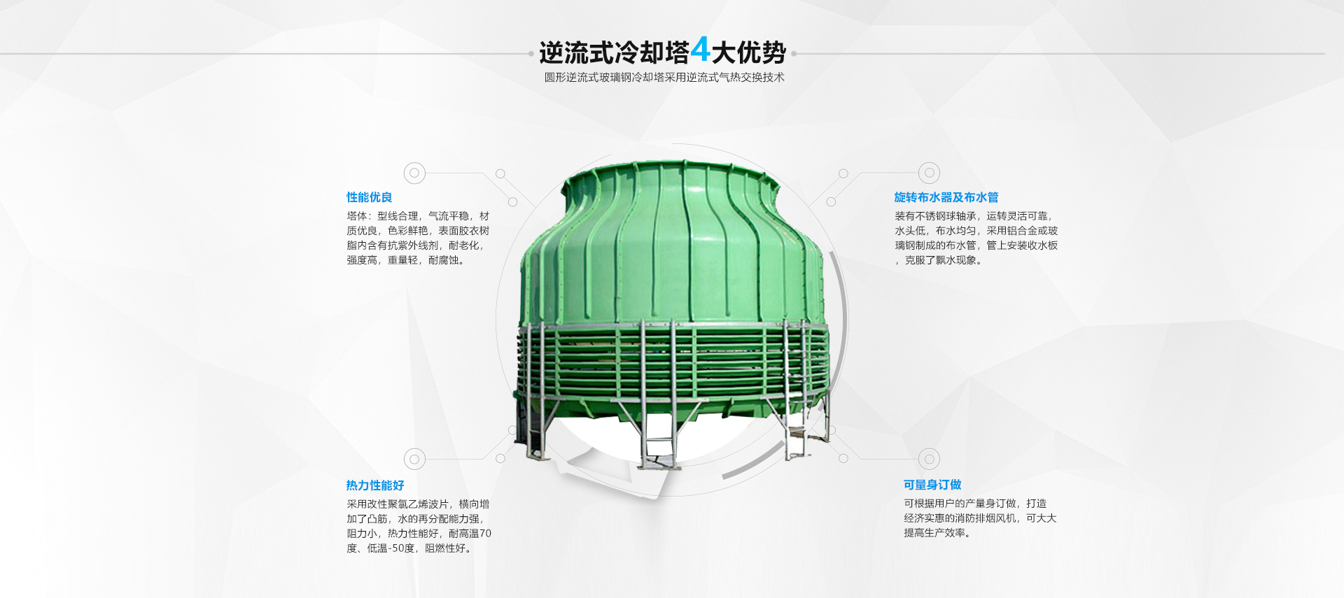 圓形冷卻塔-圓形逆流式閉式冷卻塔里面填料是PVC淋水片,以擴散淋水面積,利用旋轉布水形式,實現(xiàn)布水均勻,以加強到冷卻的效果,···